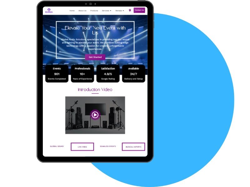 This event and audio services website was created with a vibrant and energetic aesthetic to match the brand’s dynamic industry. Using strong visuals, contrasting colors, and an engaging hero banner, the design instantly captures attention. Key stats, service features, and an introductory video section make the website both informative and visually appealing — perfect for businesses offering event sound, lighting, and production services
